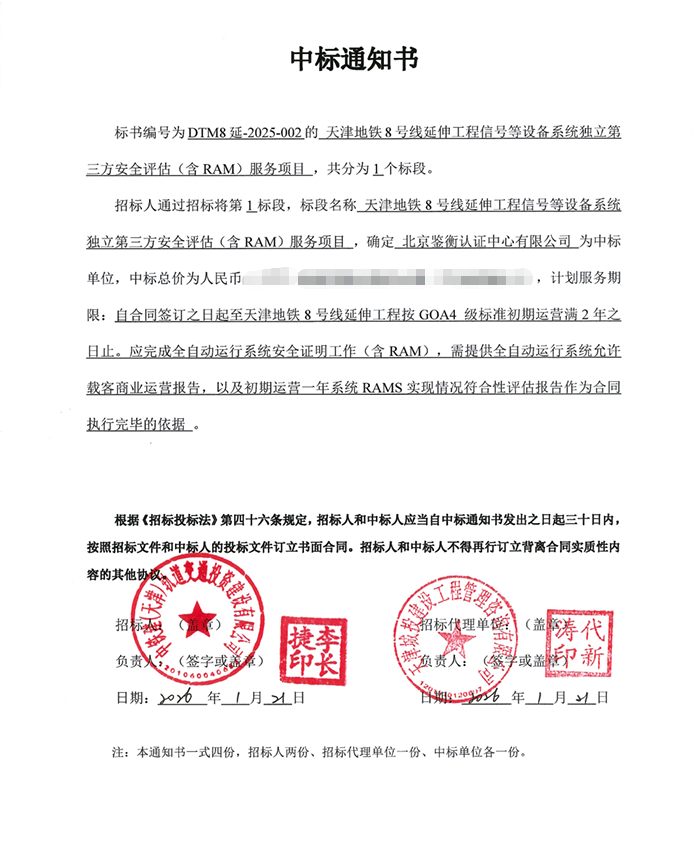 2026年1月,北京鉴衡认证中心中标“天津地铁8号线延伸工程信号等设备系统独立第三方安全评估(含RAM)服务项目”。