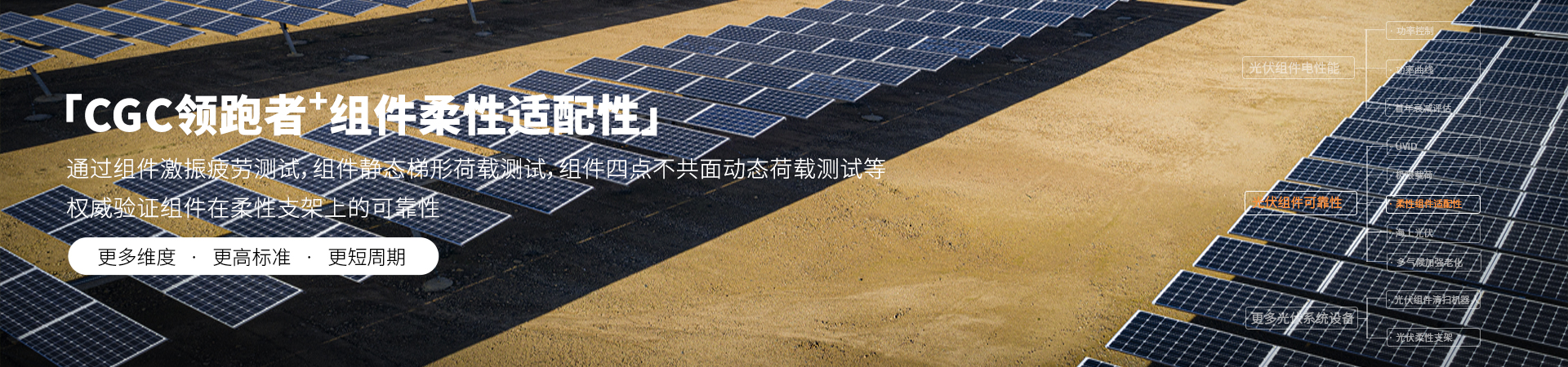 光伏组件在柔性支架上应用时,易受组件与钢索的共振激振效应影响产生机械疲劳问题,同时在极端天气条件下还可能面临强风、暴雨等带来的瞬时冲击载荷,这些因素均对组件稳定性构成挑战。因此,验证组件在柔性支架应用场景下的可靠性十分重要。CGC领跑者+“组件柔性适配性”针对柔性支架应用场景下的组件机械性能的主要影响因子,设计了组件激振疲劳测试、组件静态梯形荷载测试、组件四点不共面动态荷载测试等方案。通过科学严谨的测试方案,可为组件柔性适配性提供权威验证。