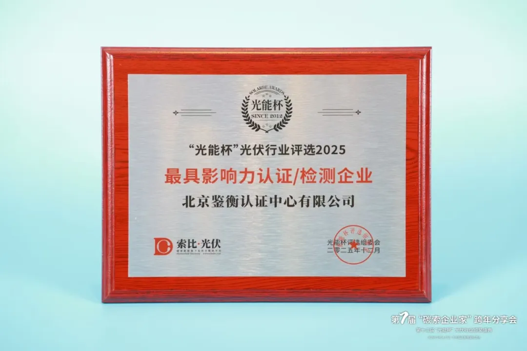 由索比光伏网主办的第四届光能杯创新分享会顺利召开。在同期举行的第十三届“光能杯”颁奖盛典上,鉴衡再度蝉联“最具影响力认证/检测企业”大奖